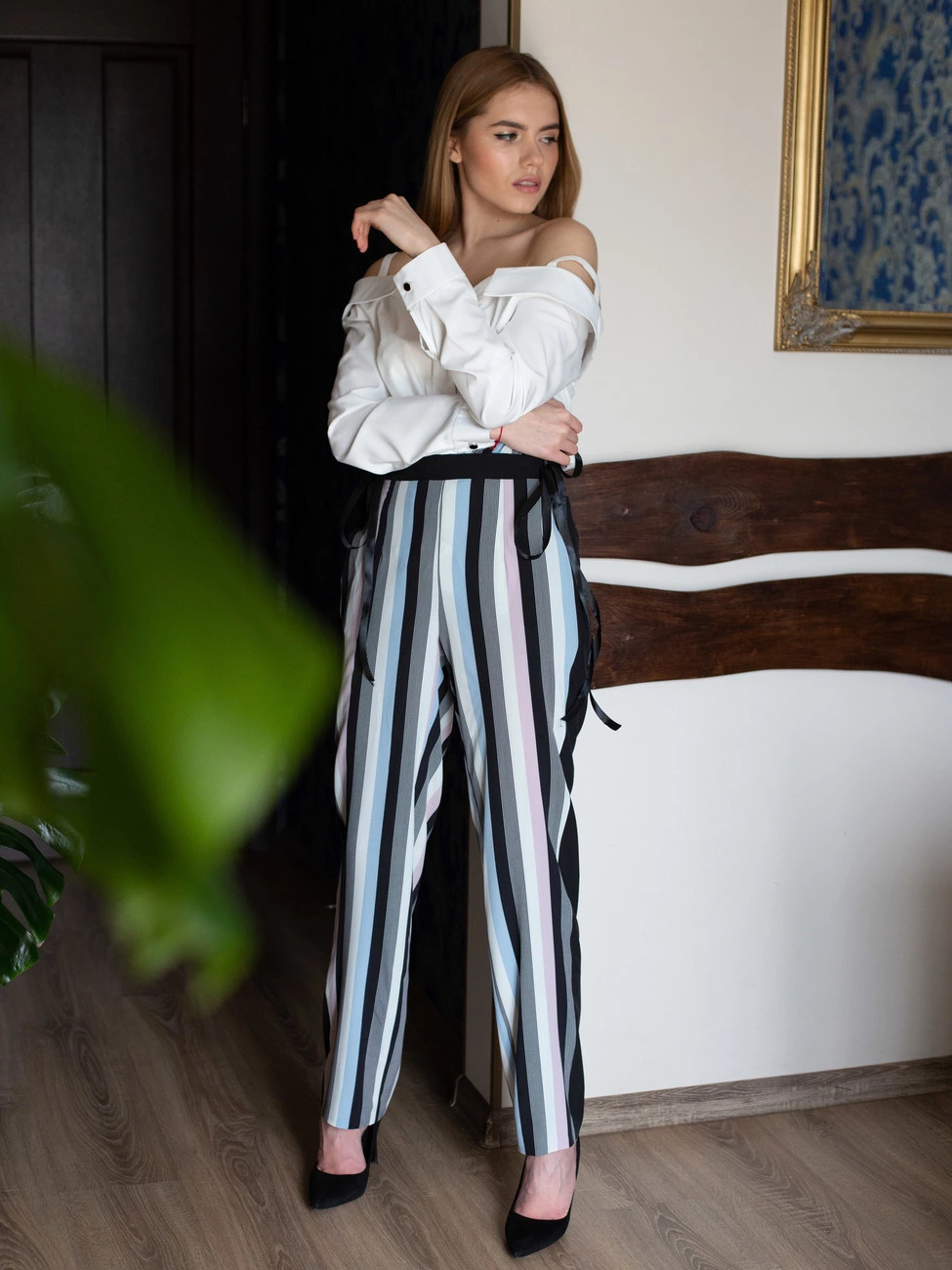 Брюки Бловди выполнены из ткани софт высокого качества. Брюки с высокой посадкой, застегиваются на потайную молнию, по бокам зав'язки. Модель гармонирует с туфлями и на каблуке, и на низком ходу.