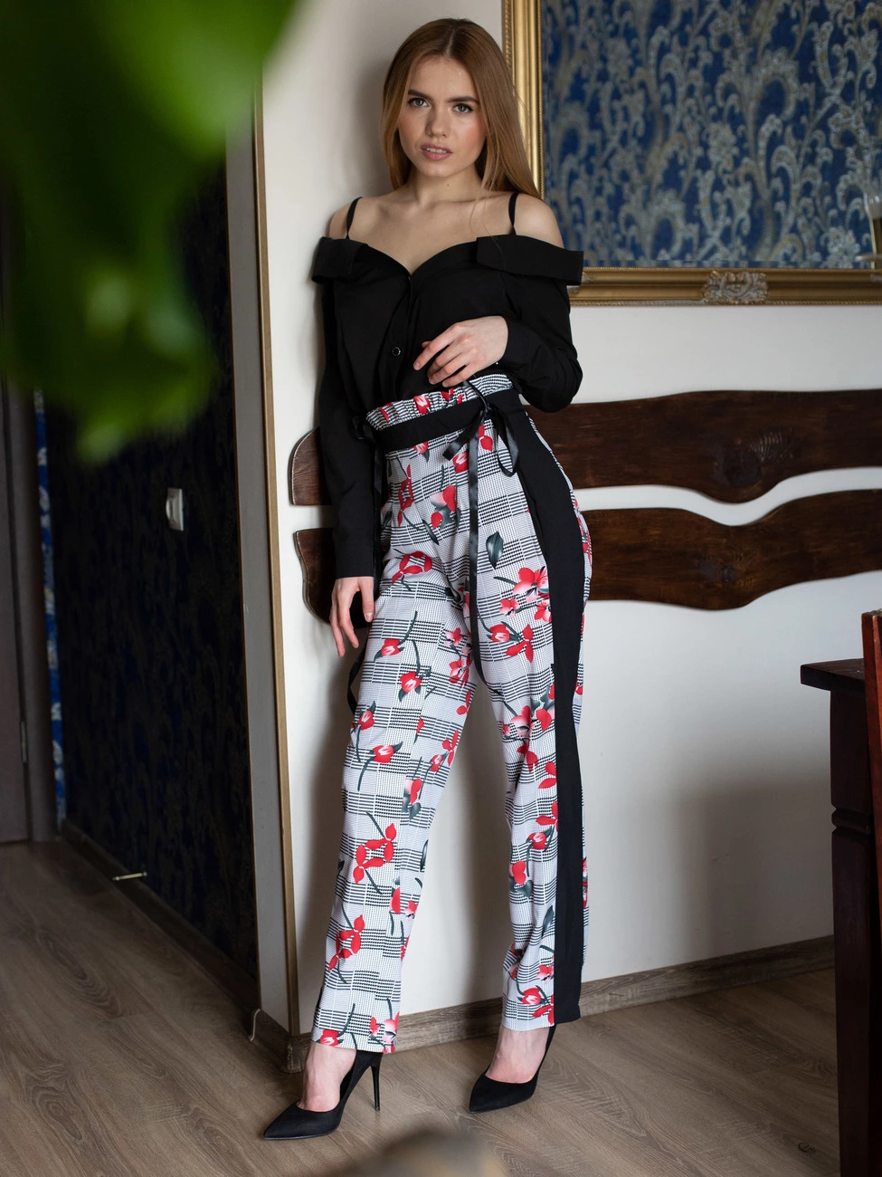 Брюки Бловди выполнены из ткани софт высокого качества. Брюки с высокой посадкой, застегиваются на потайную молнию, по бокам зав'язки. Модель гармонирует с туфлями и на каблуке, и на низком ходу.