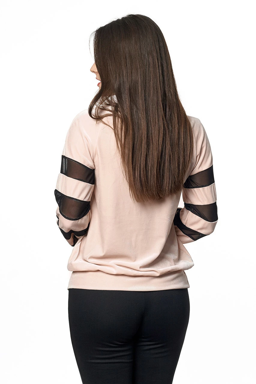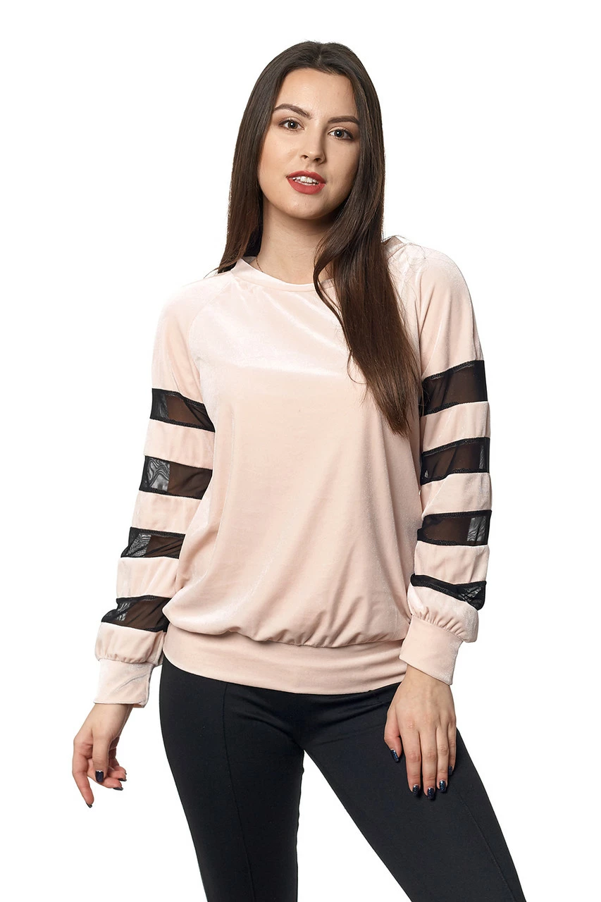 Очень стильная женская кофта выполнена из ткани велюр высокого качества. Кофта свободного покроя, рукава с вставками сетка, на манжетах. Нарядная кофта превосходно сочетается с классическими элементами гардероба, актуальными для вечернего выхода и торжественной обстановки.
