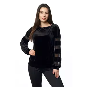 Очень стильная женская кофта выполнена из ткани велюр высокого качества. Кофта свободного покроя, рукава с вставками сетка, на манжетах. Нарядная кофта превосходно сочетается с классическими элементами гардероба, актуальными для вечернего выхода и торжественной обстановки.