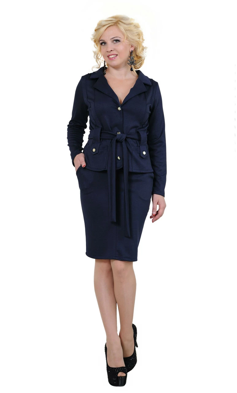 Костюм Аврора для деловой женщины, состоящий из полу приталенного пиджака с поясом до середины бедра и юбки карандаш с карманами, воротник, накладные карманы, металлические пуговицы. Ткань: трикотаж лакоста.