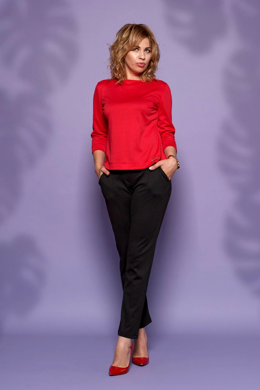 Стильный и современный костюм Бритни состоит из кофточки и брюк, выполнен из трикотажа Lacosta высокого качества. Кофточка прямого покроя с рукавом ¾, сзади по всей длине застегивается на золотистую молнию. Укороченные модные брючки со стрелкой, с высокой посадкой застегиваются на три пуговички и молнию. Такие брюки делают Вашу фигуру очень женственной, подчеркивают узкую талию и округлую линию бедер. Костюм очень модный и практичный, подойдёт на все случаи жизни.