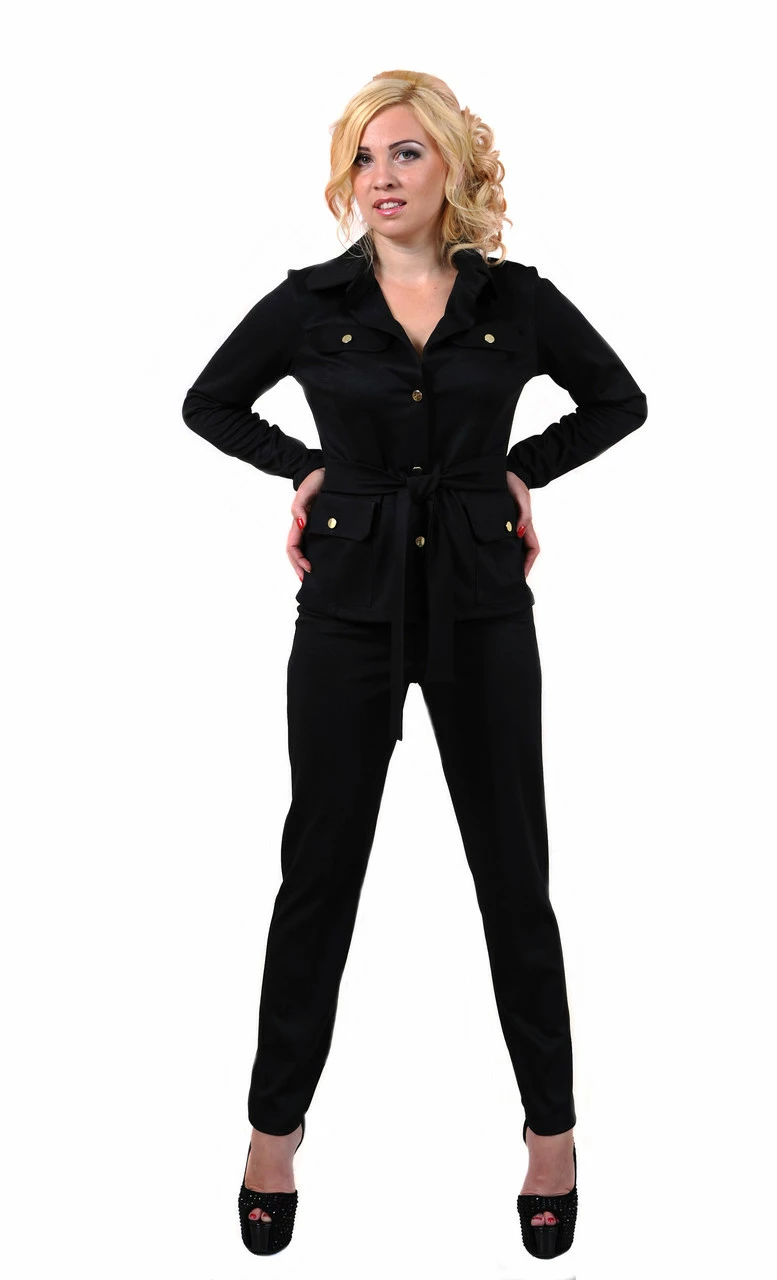 Брючный костюм Кэтрин для деловой женщины, состоящий из полу приталенного пиджака с поясом до середины бедра и зауженных, слегка укороченных брючек с идеально отутюженными стрелками, воротник, большие накладные карманы, металлические пуговицы небольших размеров. Ткань: трикотаж лакоста.