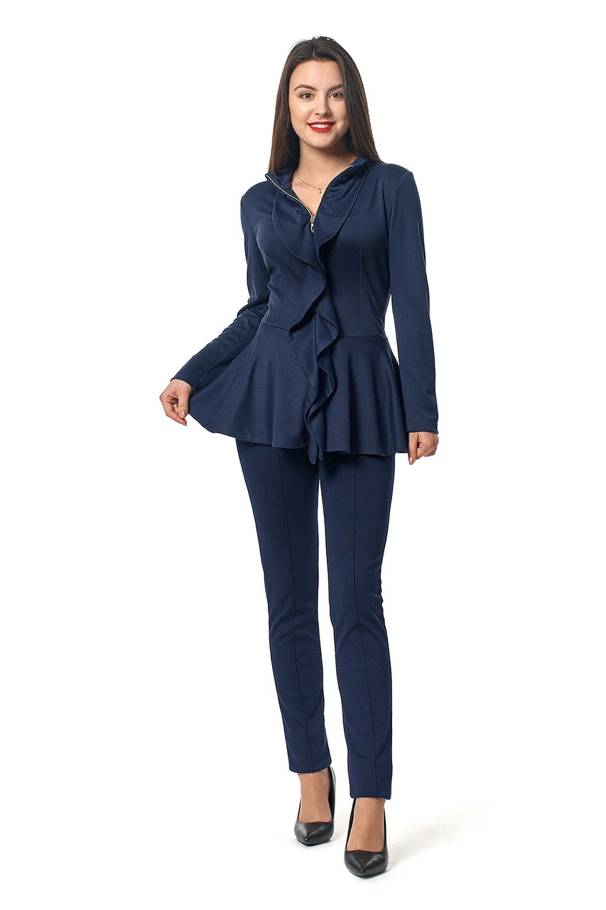 Стильный женский костюм Мейди состоит из жакета и брюк, выполнен из трикотажа Lacosta высокого качества. Пиджак слегка удлиненный с баской и длинным рукавом, застегивается на молнию. Брюки зауженные, с идеально отутюженными стрелками. Костюм отлично смотрится на любой фигуре, специальный крой скрывает недостатки и удачно подчеркивает достоинства. Такой костюм должен быть в гардеробе каждой женщины, Вы будите выглядеть очень женственно и модно. Подойдет не только на каждый день, но и для разных мероприятий.