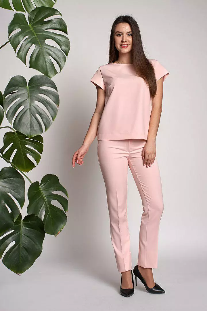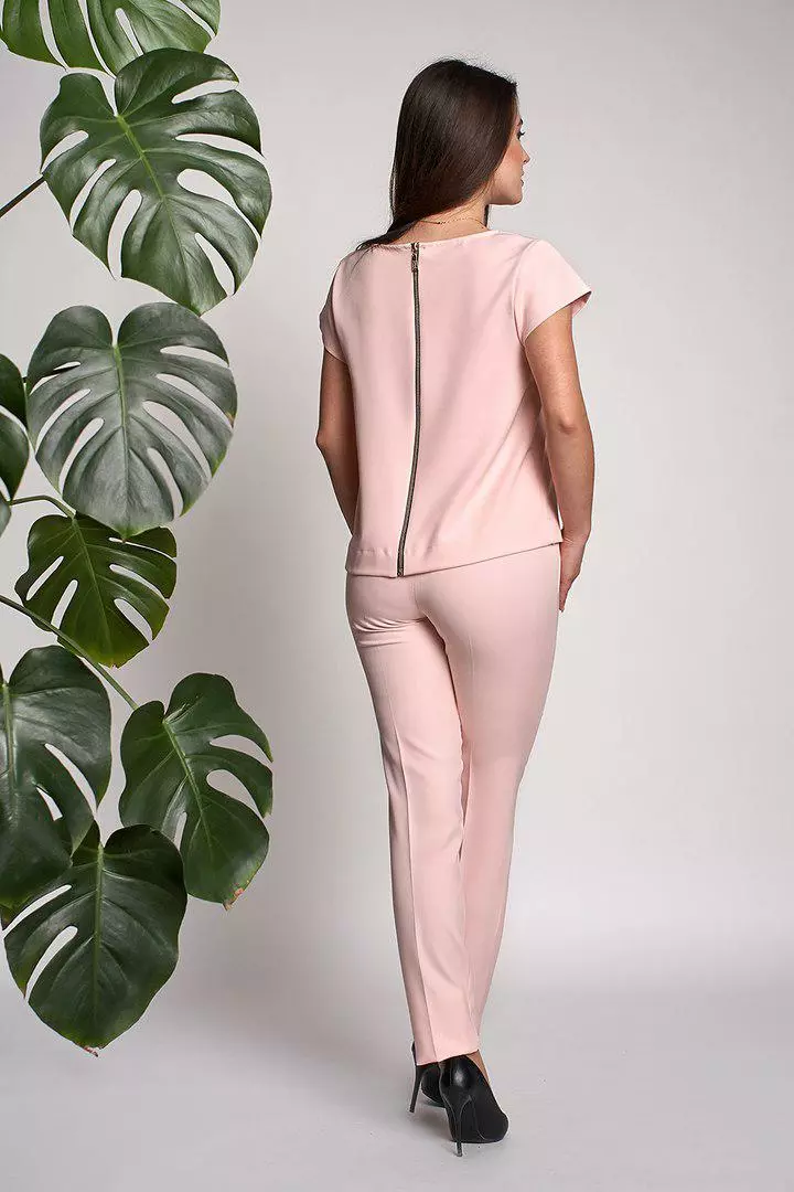 Стильный и современный костюм Нейл состоит из кофточки и брюк, выполнен из ткани креп-костюмка высокого качества. Кофточка прямого кроя с коротким рукавом, сзади по всей длине застегивается на золотистую молнию. Укороченные модные брючки со стрелкой, с высокой посадкой застегиваются на пуговицу и молнию. Такие брюки делают Вашу фигуру очень женственной, подчеркивают узкую талию и округлую линию бедер. Костюм очень модный и практичный.