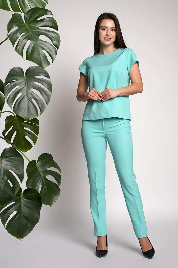 Стильный и современный костюм Нейл состоит из кофточки и брюк, выполнен из ткани креп-костюмка высокого качества. Кофточка прямого кроя с коротким рукавом, сзади по всей длине застегивается на золотистую молнию. Укороченные модные брючки со стрелкой, с высокой посадкой застегиваются на пуговицу и молнию. Такие брюки делают Вашу фигуру очень женственной, подчеркивают узкую талию и округлую линию бедер. Костюм очень модный и практичный.