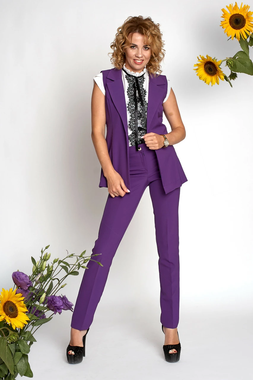 Трендовый костюм состоит из брюк и жилета. Для пошива использована ткань костюмка высокого качества. Он уместен не только в повседневных образах, в офисе, на деловой встрече, но и может служить в качестве вечернего наряда.