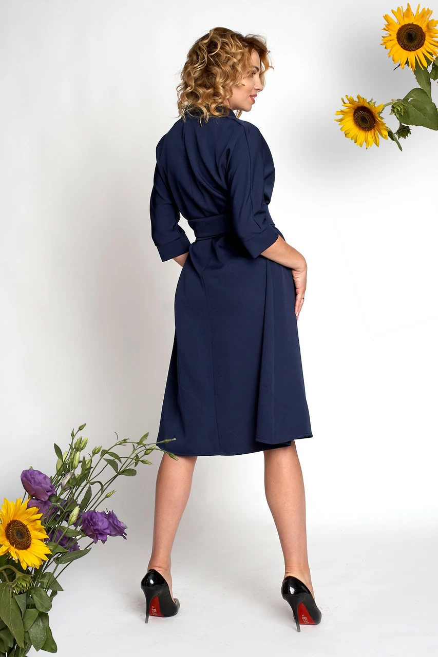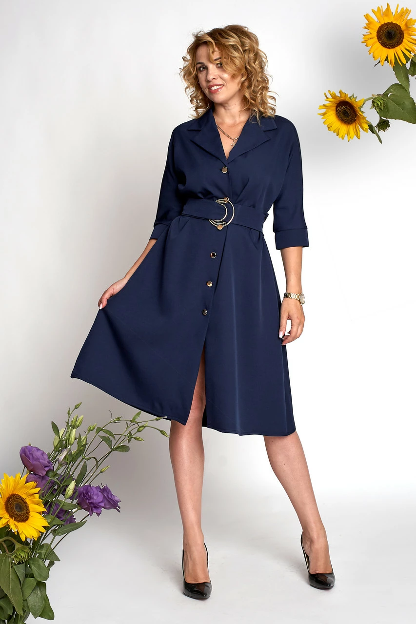 Платье Айрин выполнено из ткани костюмка высокого качества. Платье длиной за колено, застегивается на пуговицы, рукав ¾ , воротник отложной. Платье можно носить как с поясом, так и без него, пояс идет в комплекте. Такое платье идеально подойдет для различных мероприятий. Платье лучше гармонировать с босоножками или туфлями на высоком каблуке.