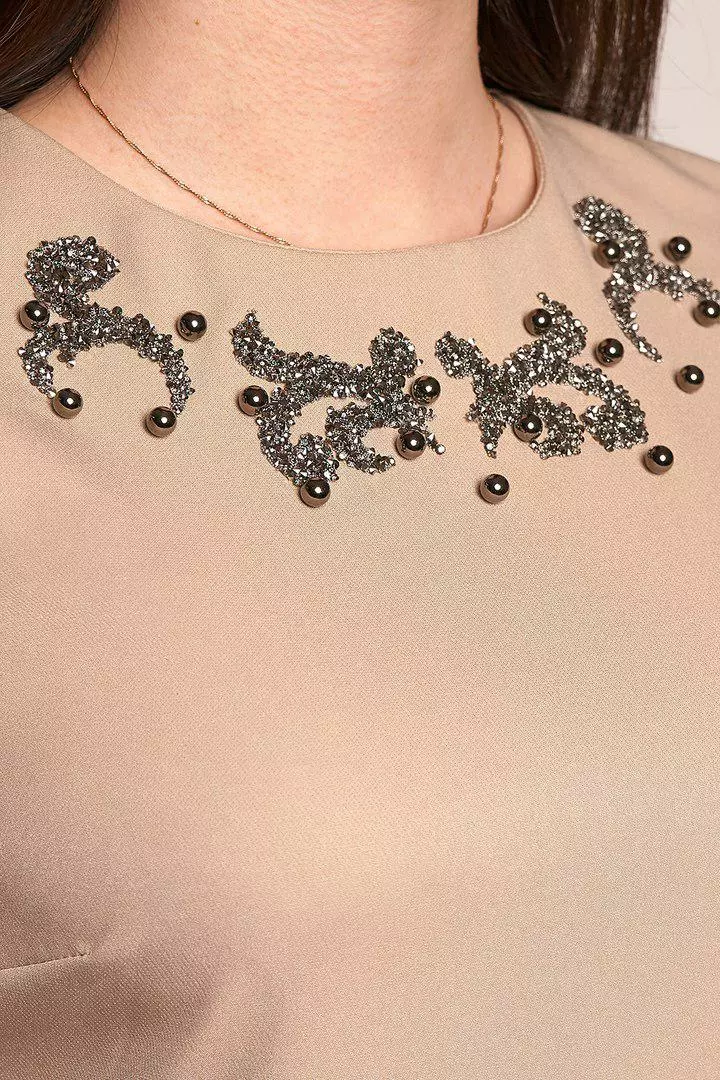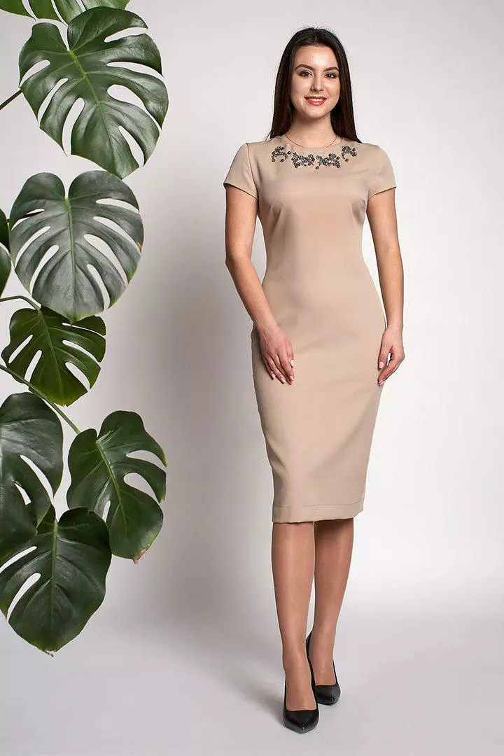 Женственное платье Мирела выполнено из ткани креп-костюмка высокого качества. Платье прямого покроя, длинной миди, с коротким рукавом. Украшением платью служат черные камни с жемчугом. Такое платье смело можно одеть на работу и на мероприятие, в нем Вы будите выглядеть женственно, стильно и красиво.