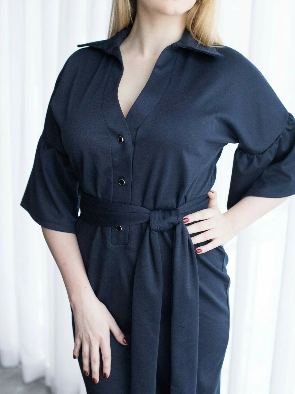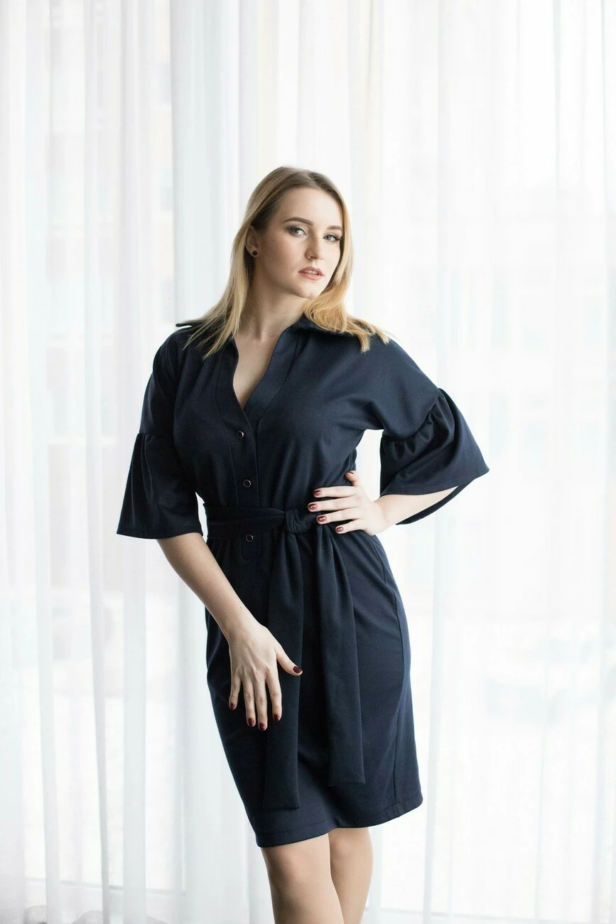 Женственное платье Теона выполнено из трикотажа Lacosta высокого качества. Платье длинной до колен, рукава расклешенной формы красивыми воланами, на пуговичках. Линию талии подчеркивает пояс, который входит в комплект.