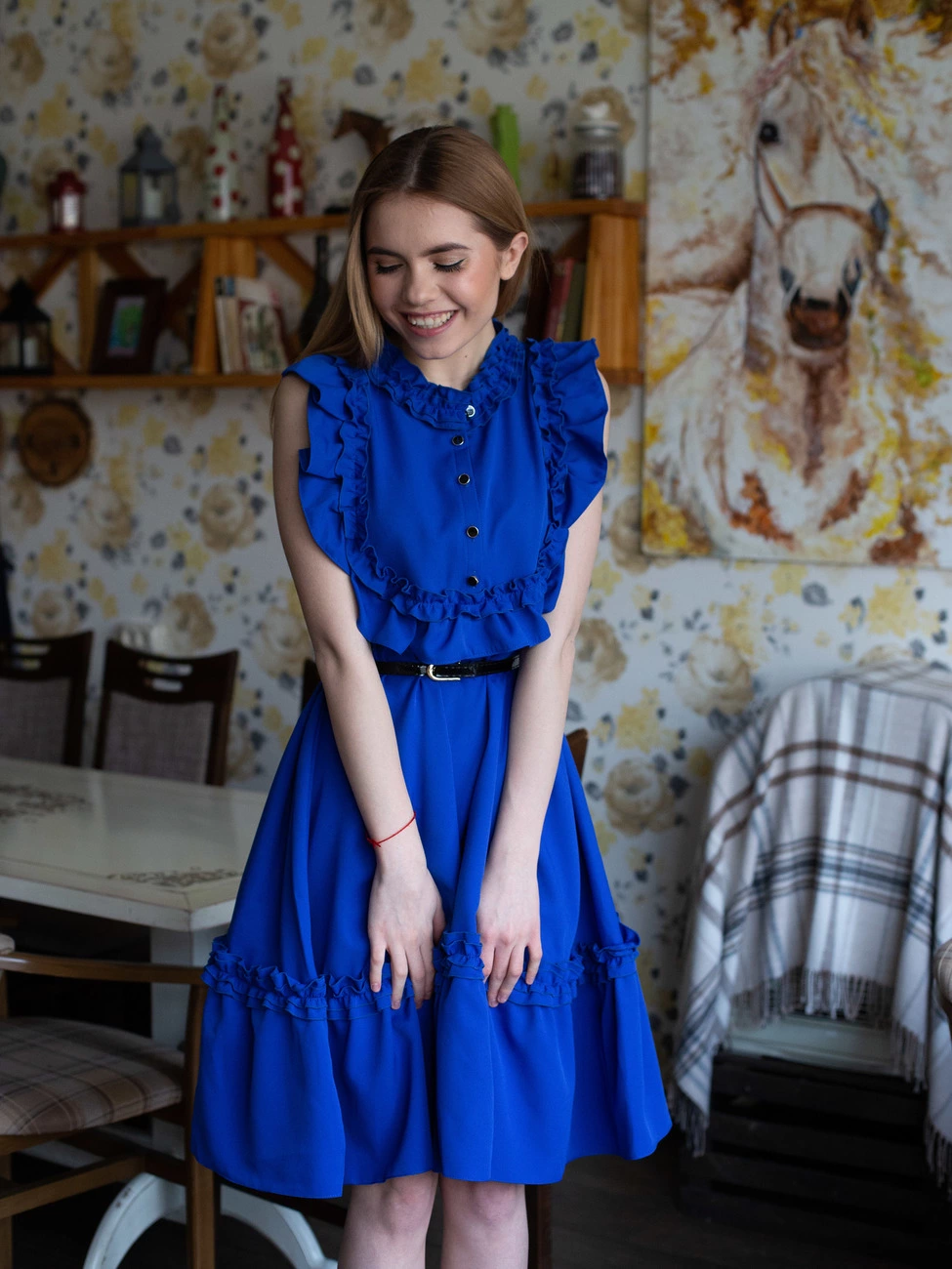 Платье Влада пошито из ткани костюмка высокого качества. Платье длиной миди, свободного покроя, украшением служат красивые рюши и пуговички на груди. Платье Влада идет в комплекте с черным пояском с золотистой пряжкой. Такое платье отлично подойдет для любого типа фигуры, в нем Вы будете выглядеть потрясающе. Красиво смотрится с туфлями – лодочками.