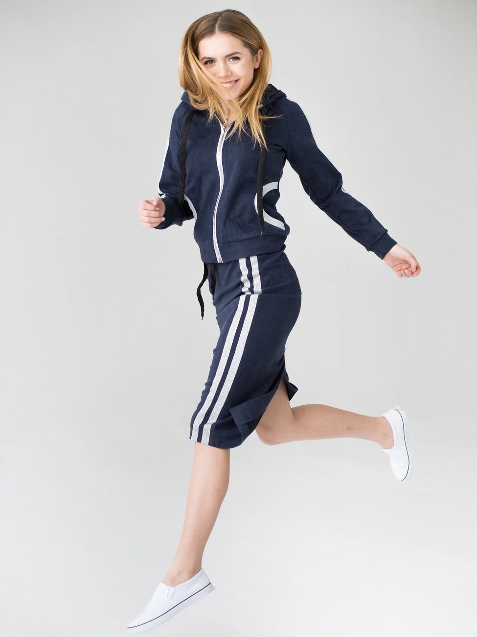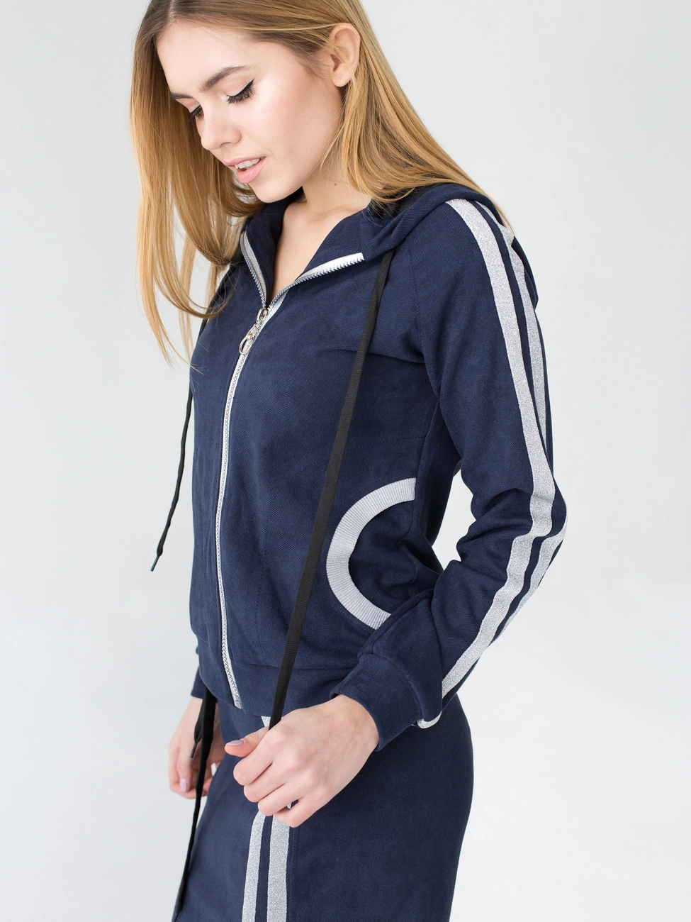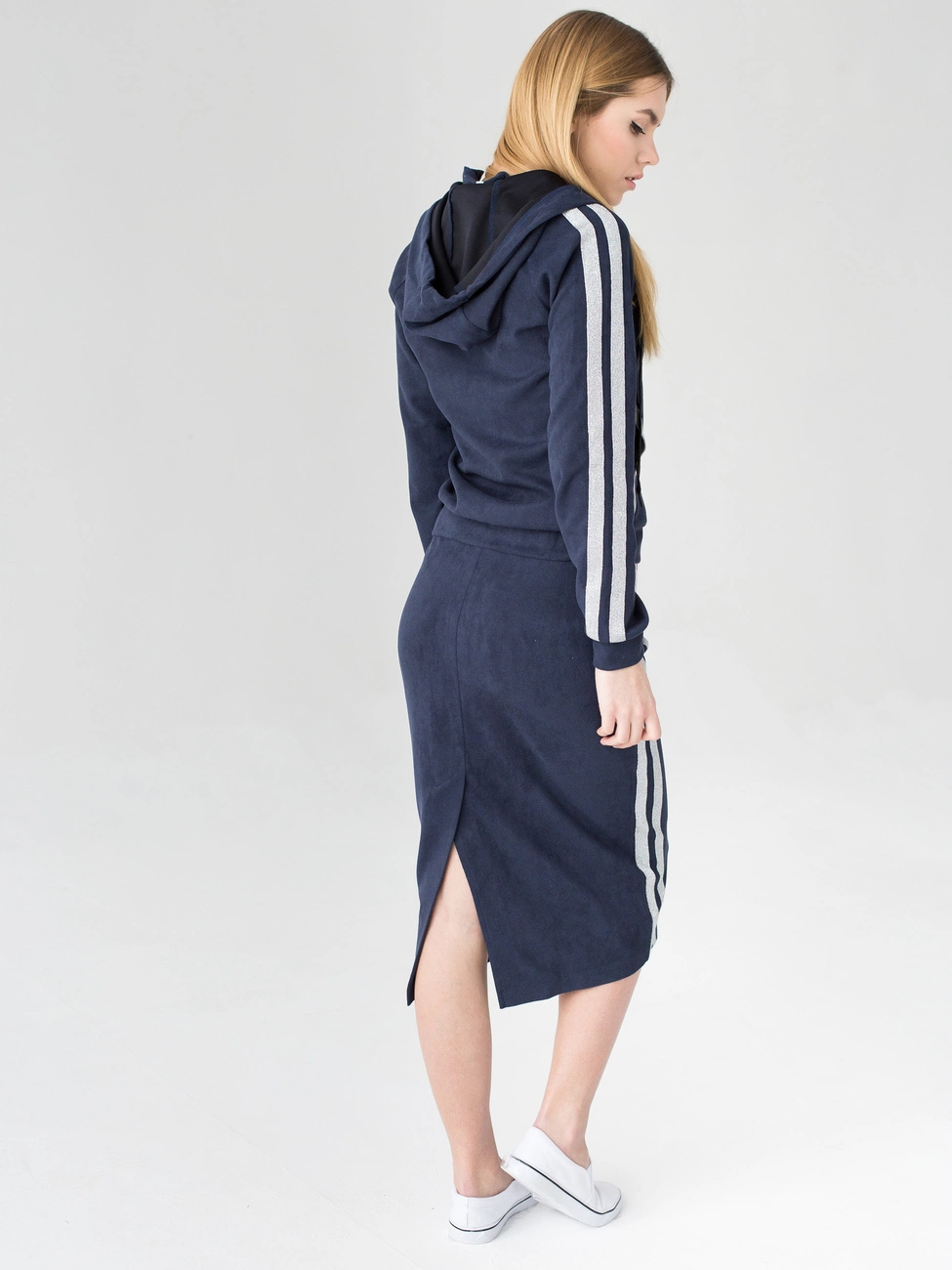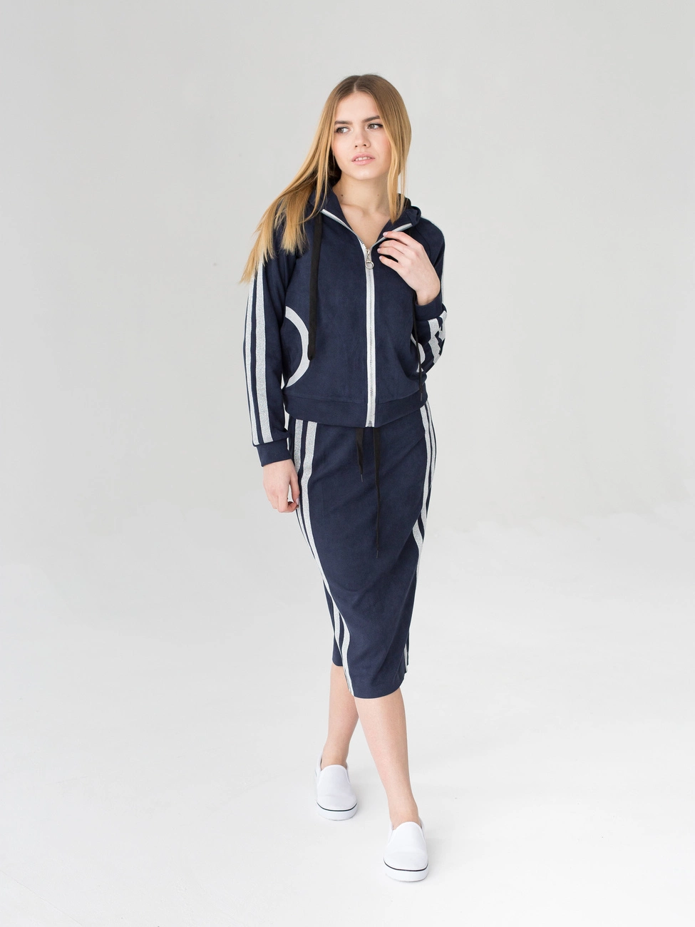 Женский костюм Энди выполнен из ткани твид высокого качества. Костюм состоит из кофты и юбки. Кофта с длинным рукавом, застегивается на молнию, по бокам карманы, есть капюшон. Юбка длиной миди, пояс на резинке. Высоту посадки юбки можно регулировать кому как удобно. Декором костюма служат актуальные серебряные полоски на рукавах кофты и по бокам на юбке. Такой костюм идеально подойдет для ежедневной носки, прогулок, для работы. В нем Вы будите себя чувствовать легко и комфортно.